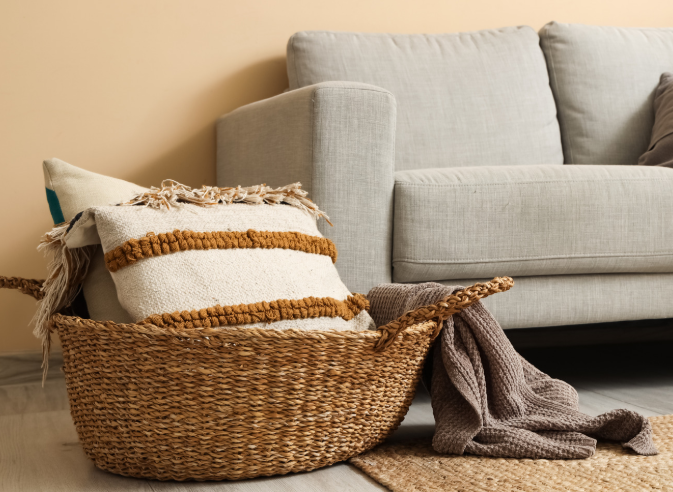 Living Room Reset (throws, pillows, lighting, storage baskets)