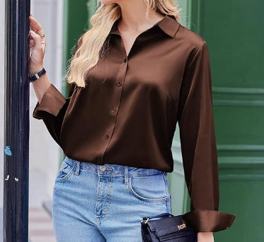 Sleek in rich chocolate brown, this silky shirt transitions effortlessly from casual to dressy. Wear it under a sweater, layered with a jacket, or on its own for a polished look that works day to night. (15 colors)