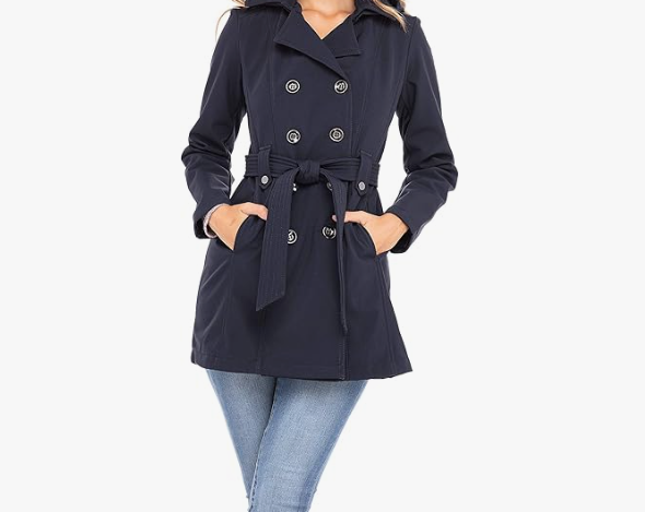 A classic button-front trench in a soft-shell fabric with stretch side panels, a flattering belted waist, and easy-care machine washable design — tailored to fit and move with you. (5 colors)